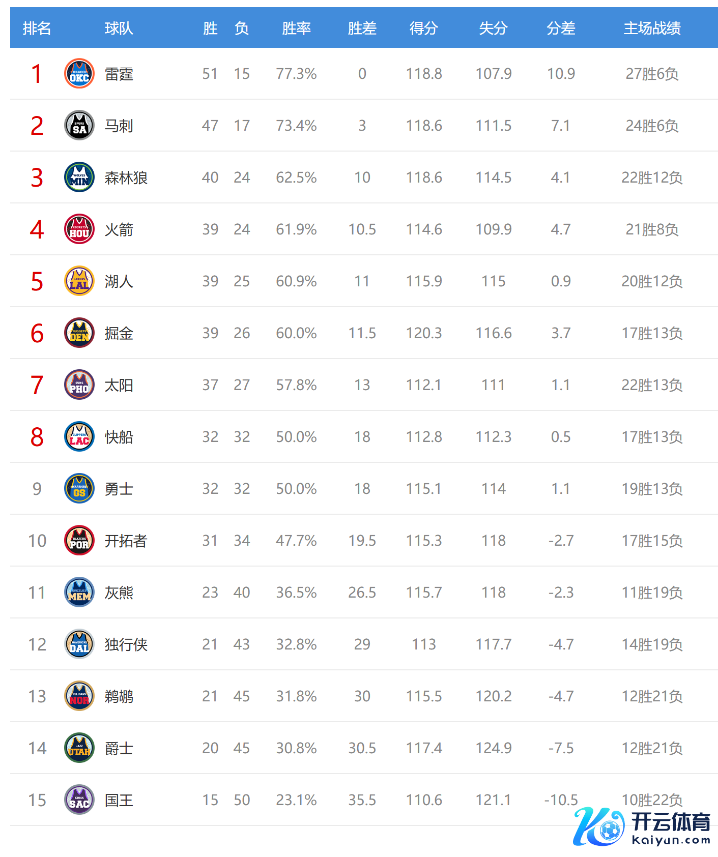 雷霆赢球后6连胜,战绩51胜15负排行定约第一,掘金输球后2连败,战绩39胜26负,排行西部第六,过期第五的湖东说念主0.5个胜场,零碎第七的太阳1.5个胜场,掘金近段期间的战绩不睬念念,排行也从西部第三掉到第六。