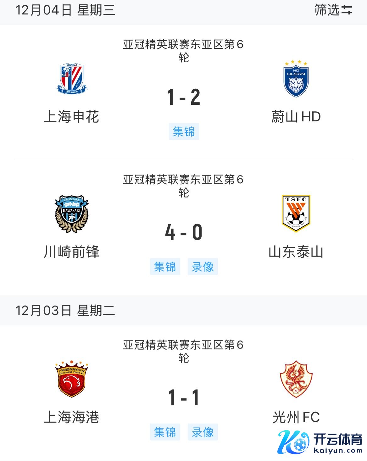 直播吧12月04日讯 亚冠精英联赛东亚区第6轮战罢,中超三队本轮战绩如下: