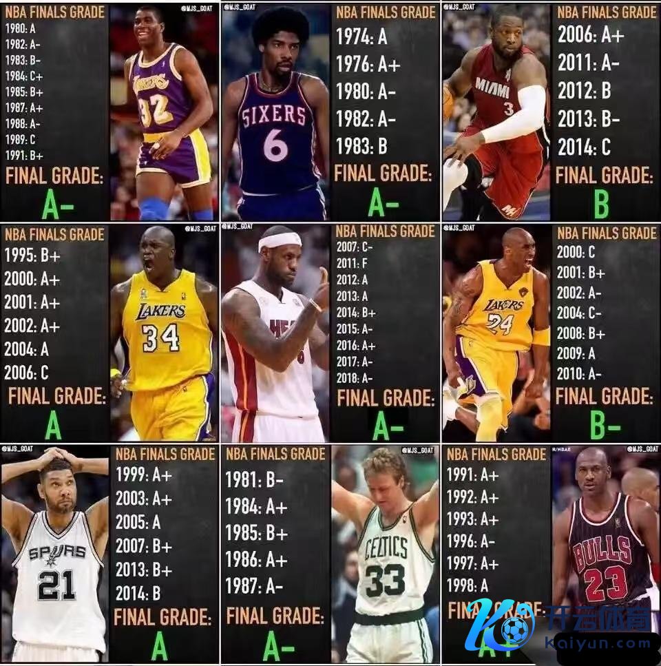 邓肯行动历史上最顶级的大时尚,能得到这样高的评价照实挺合理的。固然他在2014年的总决赛进展相对差一些,但那一年他也拿了B,要知说念那年他照旧全队到手孝敬值最高的球员。更牛的是,他在1999年和2003年齐拿了A+。相配是2003年,他一个东说念主带队夺冠,那一年的总决赛他场均能拿到24.2分、17个篮板、5.3次助攻和5.3个盖帽,几乎即是管辖级别的进展。