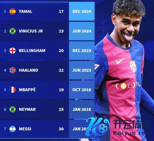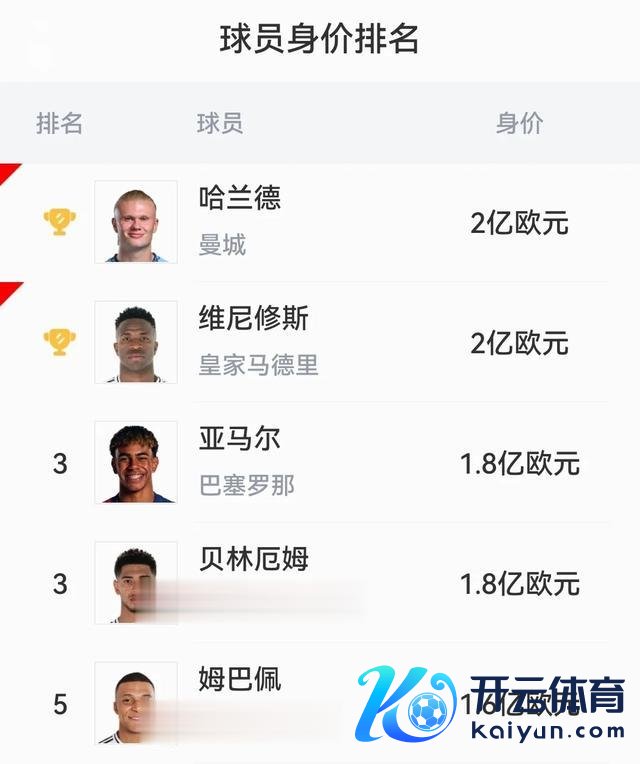 亚马尔在2024年12月时领有了1.8亿欧元的身价。他亦然年级最小(17岁)得回如斯高的身价。姆巴佩早在2018年10月(年仅19岁)得回1.8亿欧元的身价。贝林厄姆在2023年12月(年仅20岁)身价达到1.8亿欧元。哈兰德2023年6月(22岁时)以1.8亿欧元的身价引东说念主扫视。维尼修斯则是在2024年6月(23岁时)身价攀升至1.8亿欧元。